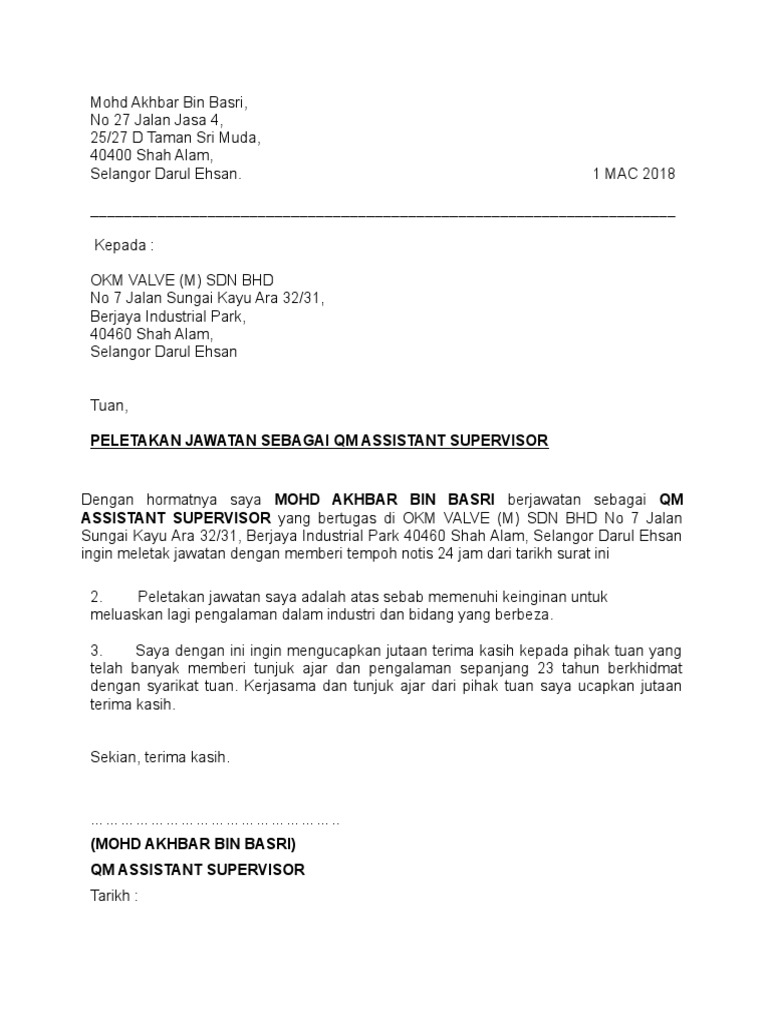 13 April 2018 Nama Pekerja Alamat Cik Ali PENERIMAAN PELETAKAN JAWATAN Surat Perletakan Jawatan bertarikh. Web SURAT PERLETAKAN JAWATAN. Web Contoh surat perletakan jawatan notis 24 jam berikut ialah contoh surat berhenti kerja kerana telah mendapat tawaran di tempat lain dengan notis 24 jam.